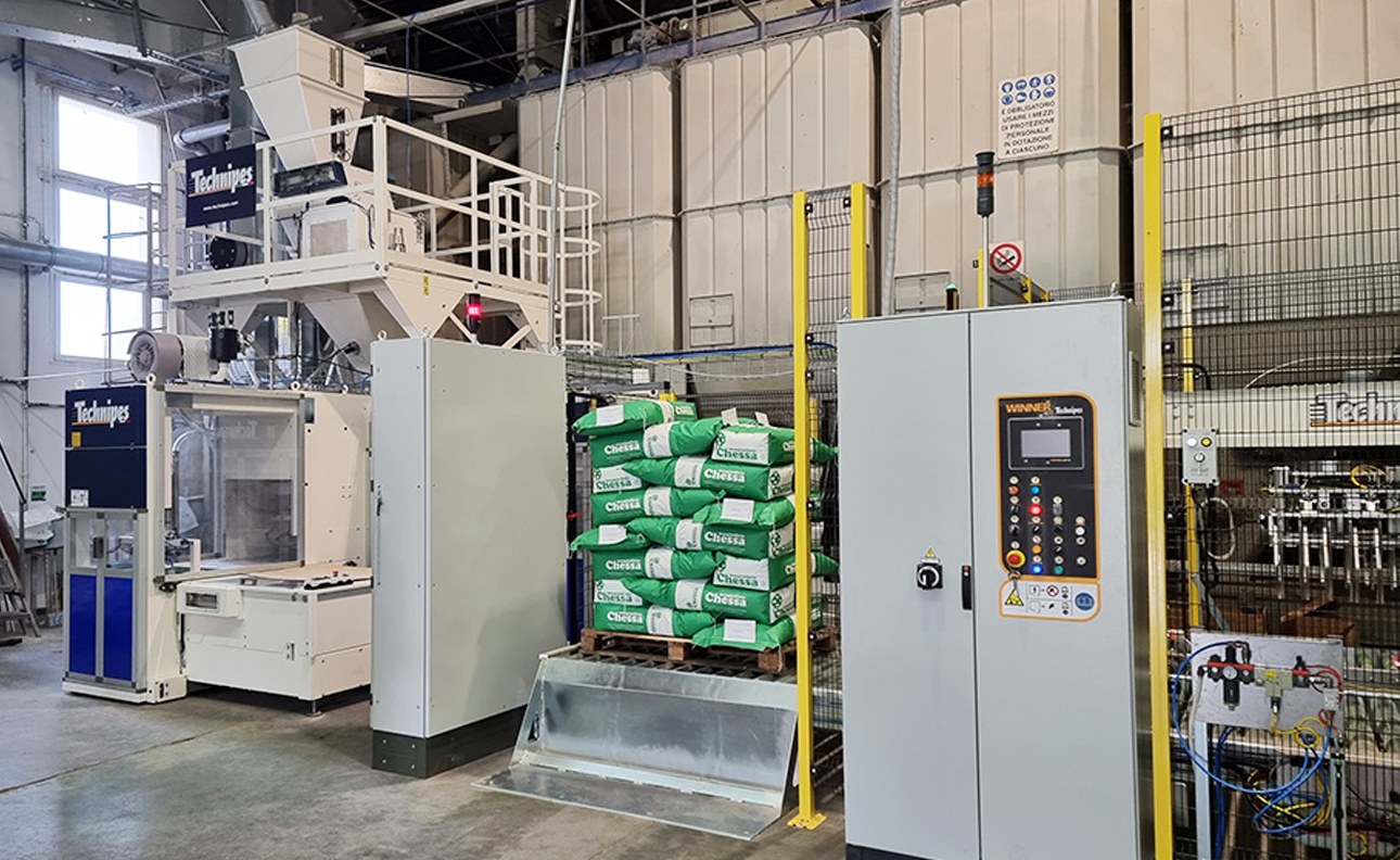 Entrepôt avec alimentateur de sacs.