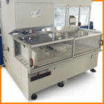 Découpe de la lisière du sac en vue de la préparation de la phase de double pliage ultérieure et application de papier pré-encollé avec thermo-+scellage.