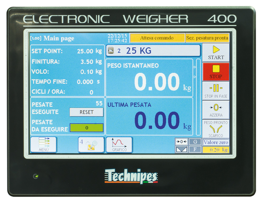 Les balances électroniques TECHNIPES intègrent une nouvelle technologie de gestion et de contrôle sophistiquée, fruit de ce travail, dans les nouvelles unités de contrôle électroniques 400, pour la gestion instantanée des paramètres de fonctionnement, notamment : un écran tactile couleur de 7 pouces mesurant 155 x 95 mm et un indice de protection IP65 / NEMA 4 pour l'affichage constant des informations suivantes : fonction et état de la balance, double affichage du poids (instantané et dernière pesée effectuée) via l'affichage à cinq chiffres.