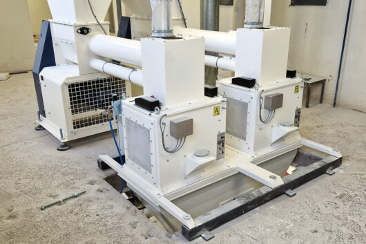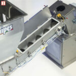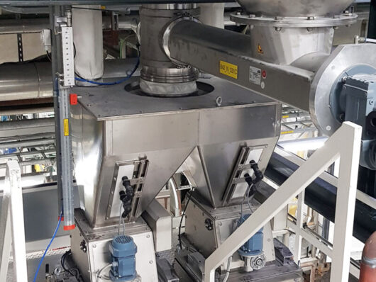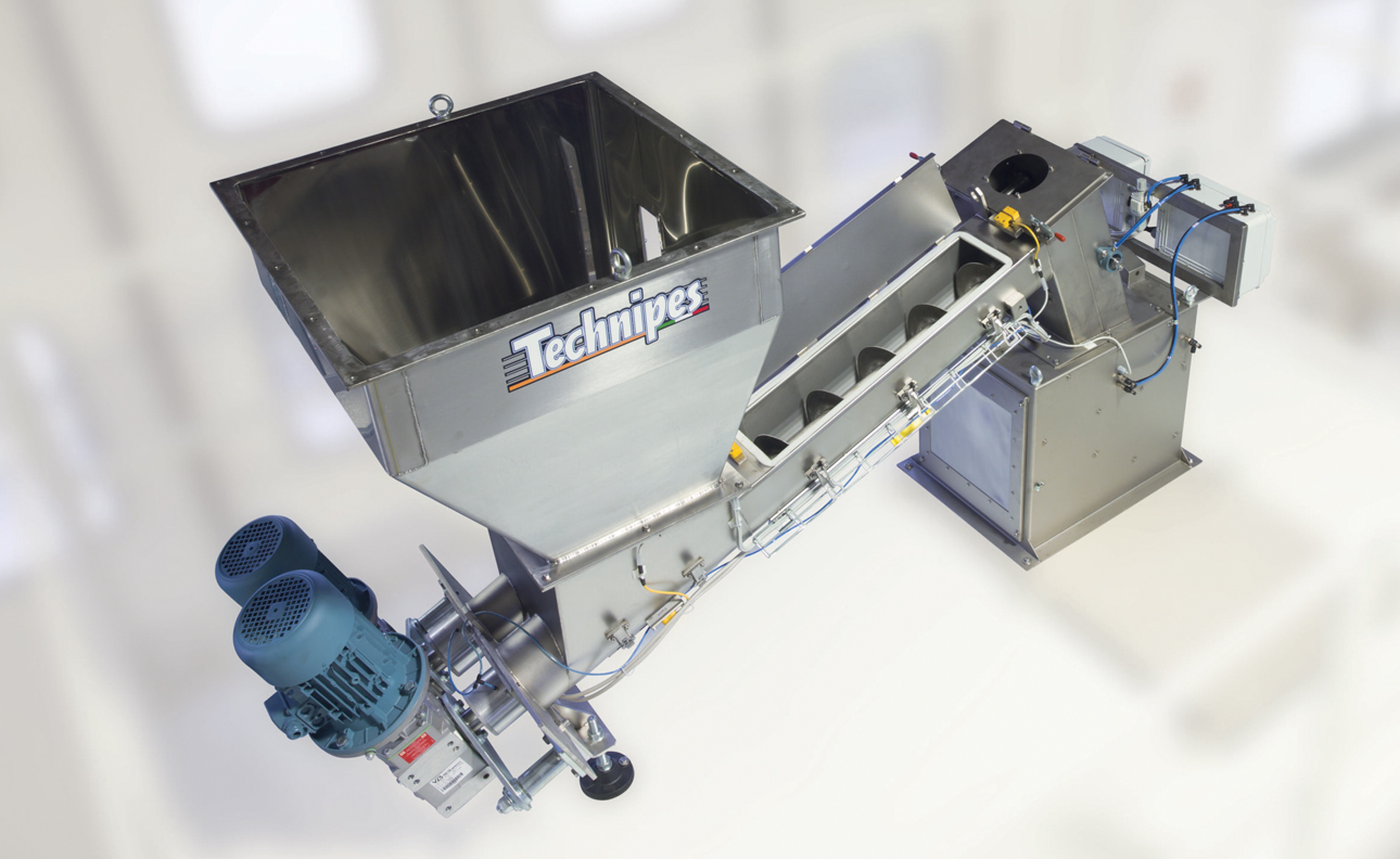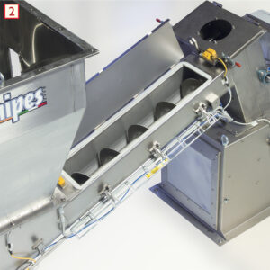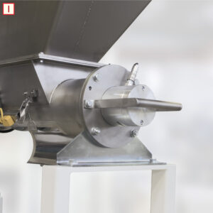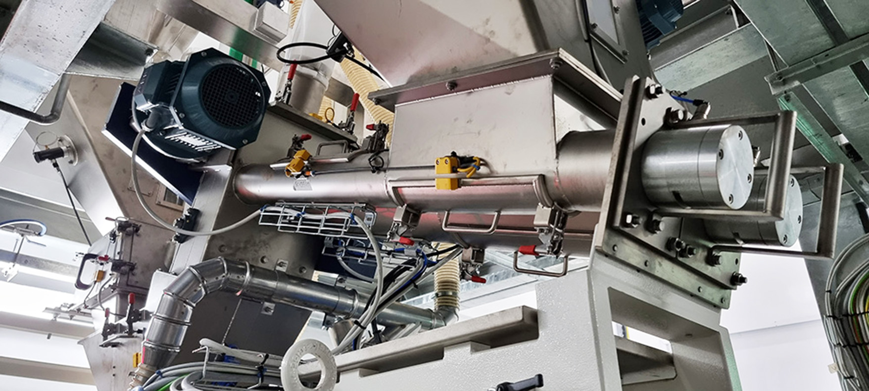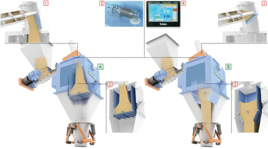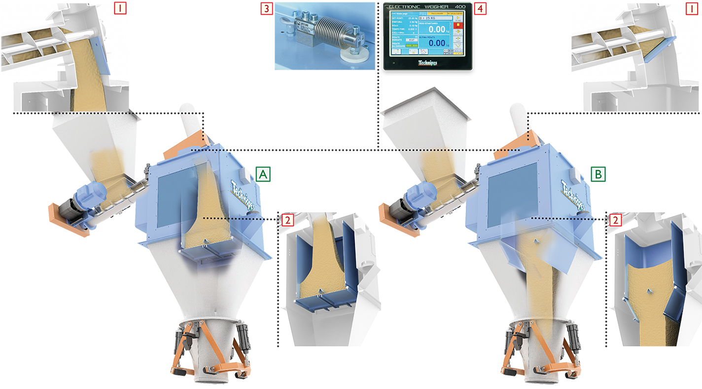 - Système d'alimentation à turbine horizontale complet avec transmission par courroie trapézoïdale, équipé de deux vannes à guillotine pneumatiques pour effectuer les deux phases de pesage : ébauche (rapide mais peu précise) et finition (lente et très précise).