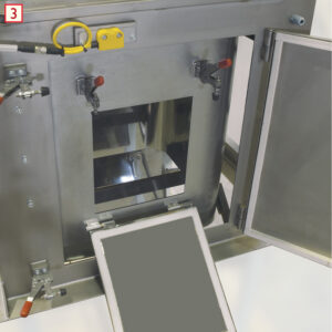 B. Phase de déchargement : le système de dosage est arrêté afin d’éviter tout débordement de produit dans le conteneur de pesée. Les trappes inférieures du conteneur s’ouvrent, permettant au produit de tomber vers le système d’ensachage. Cette opération se poursuit jusqu’à ce que le conteneur de pesée soit complètement vide, après quoi les trappes inférieures se referment, permettant ainsi le cycle de pesée suivant.