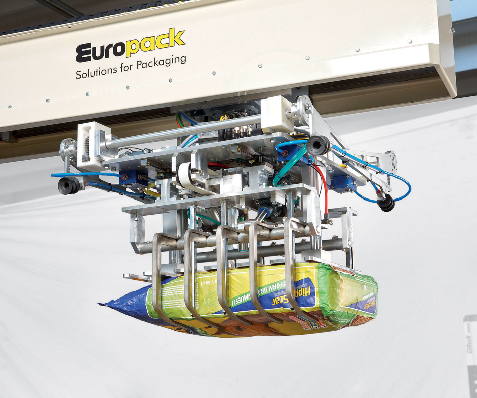- Comment fonctionne la palettisation des sacs : Notre tête de préhension de type fourche, avec guides latéraux et poussoir supérieur, conçue spécifiquement pour les sacs, assure une précision et un soin maximum lors de la prise et du placement du produit.
