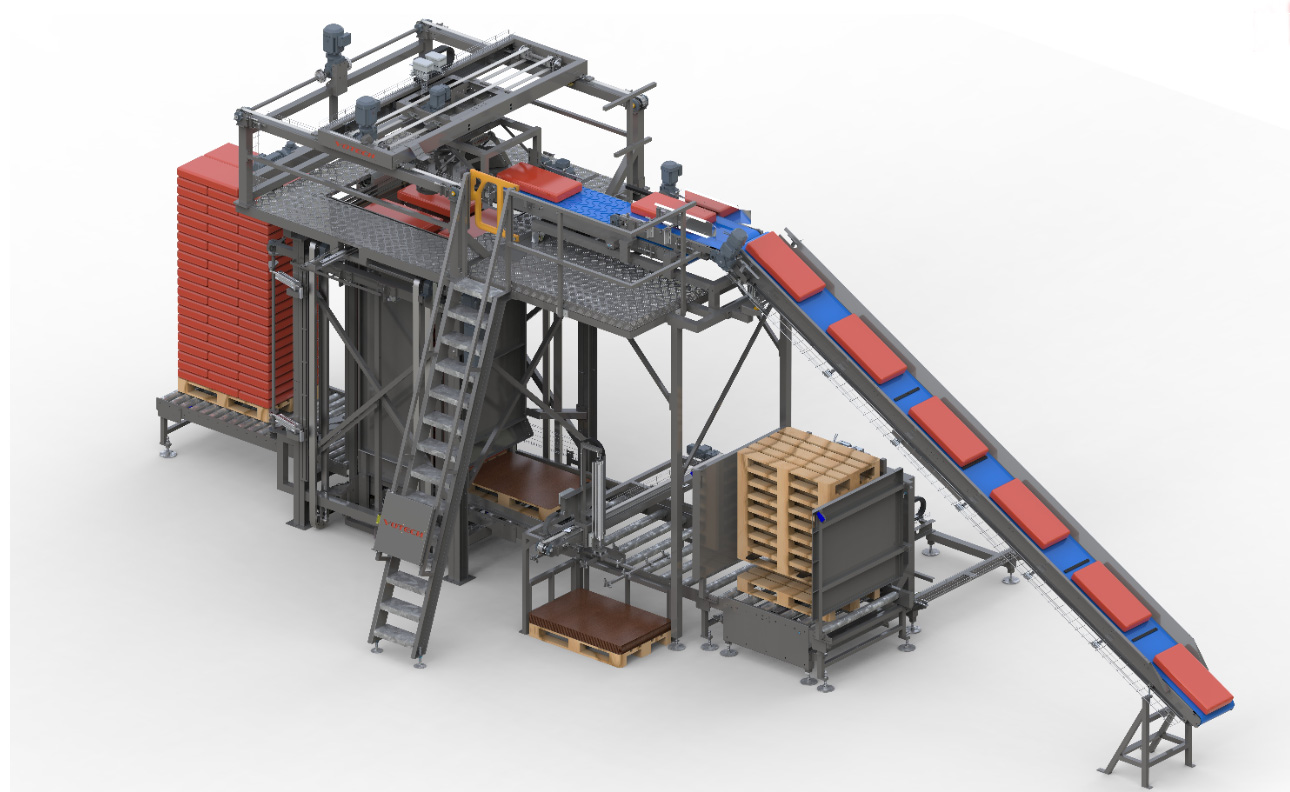 - Cage de palettisation pour éviter tout dépassement de la charge au delà des dimensions de la palette, ceci autorise  une efficacité optimale pour le transfert dans les entrepôts ou le remplisage de conteneurs et sans endommager les sacs ou perte de produit.