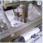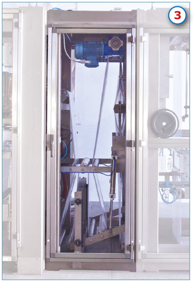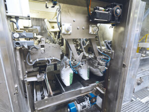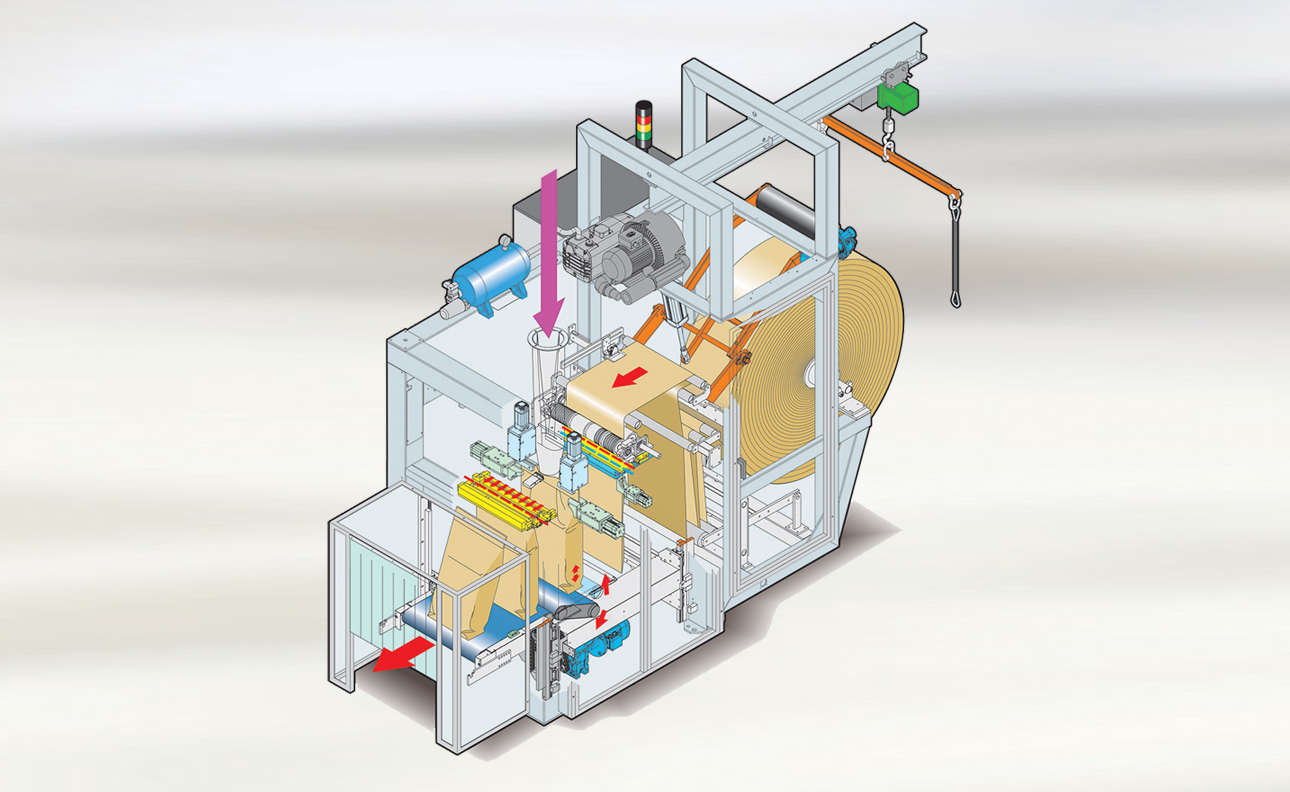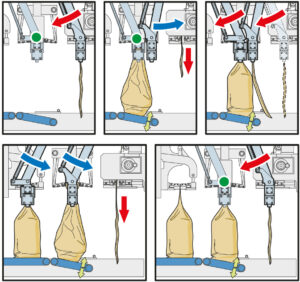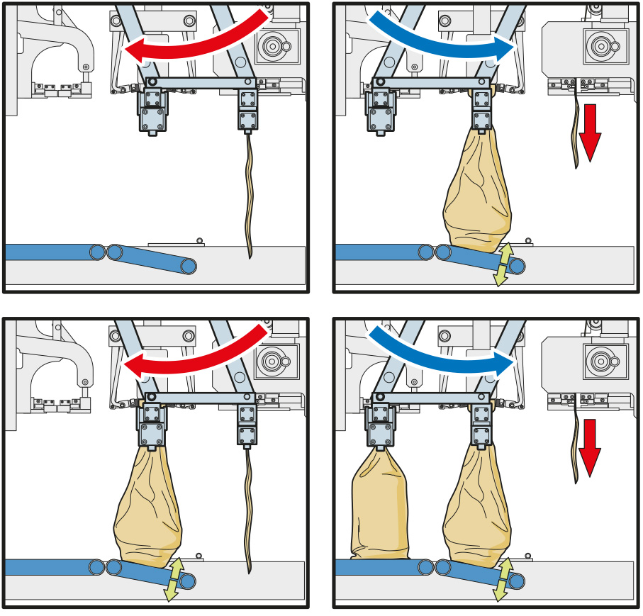 Le cycle de fonctionnement repose essentiellement sur un bras à mouvement pendulaire qui ramasse le sac vide et le place sous l'orifice de remplissage, puis le conduit sous la zone de scellage final.