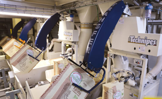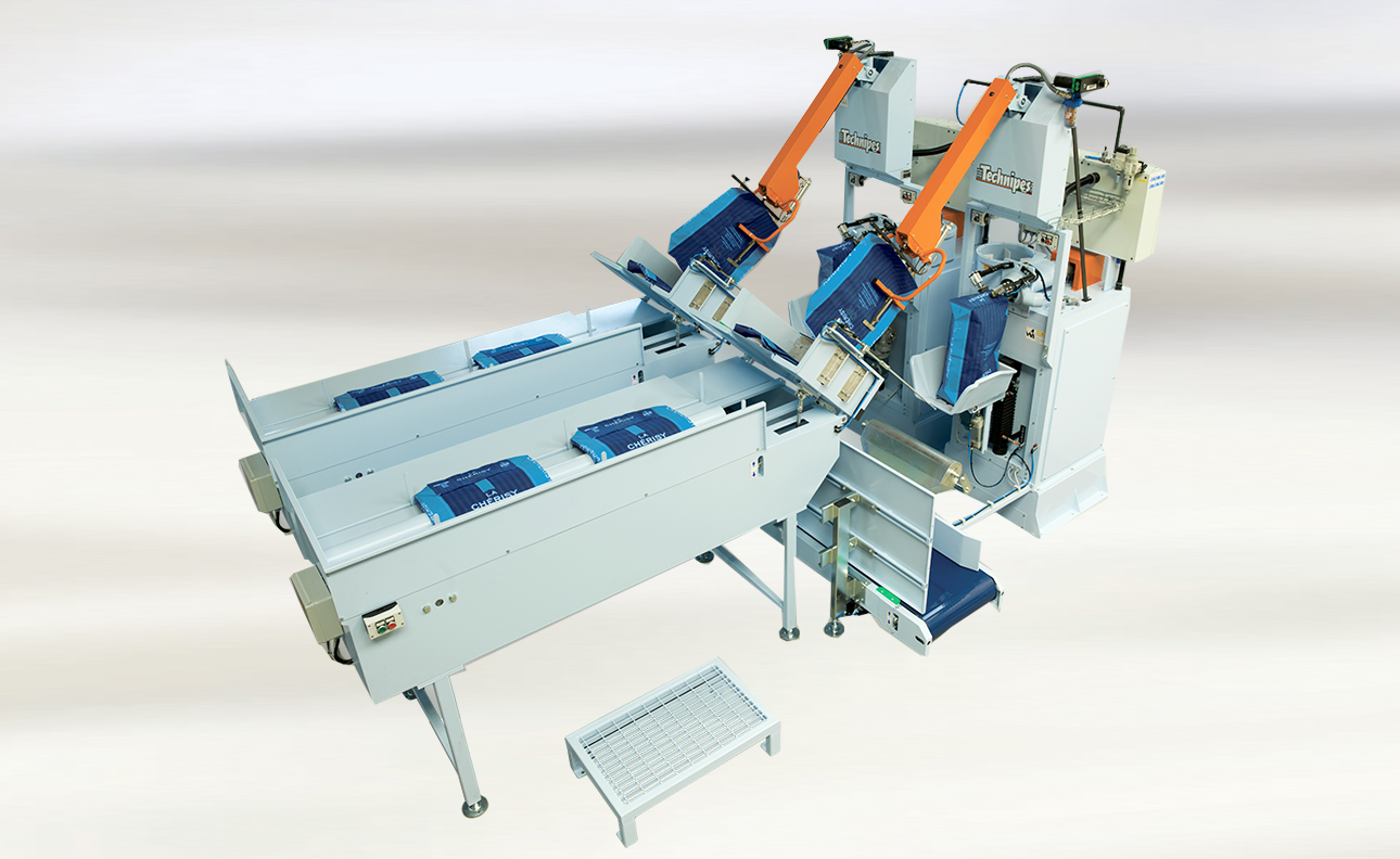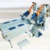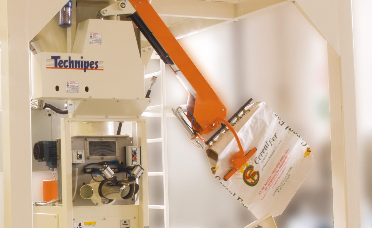 Le modèle R est le système traditionnel et le plus répandu. La machine prélève le sac vide dans le magasin, situé sur le côté de l’ensacheuse (à droite ou à gauche), et, par un mouvement de rotation combiné à une inclinaison, dépose le sac sur la buse de remplissage.