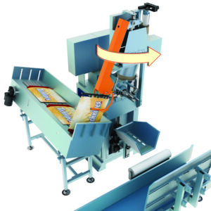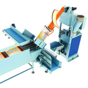 Ce modèle diffère du type R en ce qu’il ne possède pas de rotation du bras, mais celle-ci est remplacée par un chargeur doté d’une plaque mobile qui place la pile de sacs dans la position de préhension optimale pour le bras de transfert.