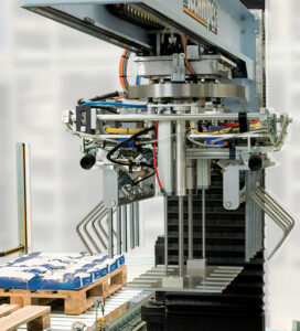 Tête de prise multifonction pour le prélèvement du sac à palettiser, des palettes vides et des éventuelles feuilles intercalaires. Durant la phase dépose du sac, celui-ci est pressé par l’aplatisseur à com-mande pneumatique afin d’améliorer la stabilité de la palette.