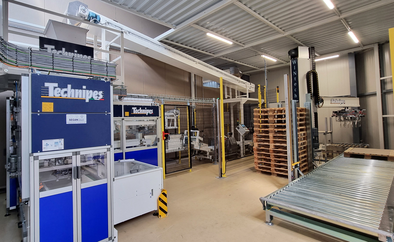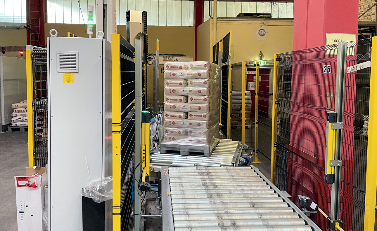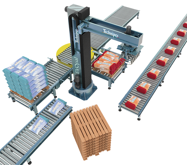 Successivement ont été ajoutés le convoyeur de palettisation et d’évacuation palettes pleines, le magasin d’intercalaires et le magasin palettes vides.