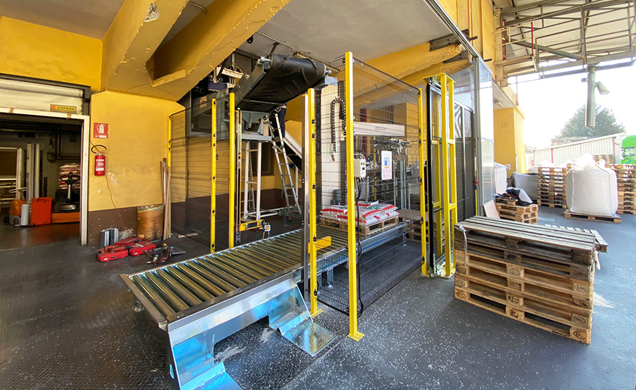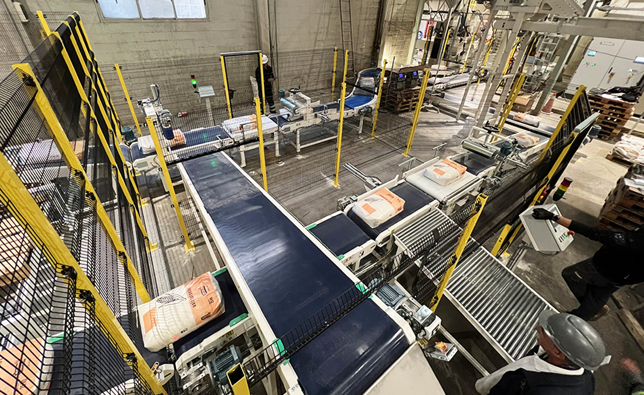 Ont été ajoutés un second convoyeur d’alimentation sacs, une deuxième zone de palettisation et un convoyeur d’évacuation permettant de palettiser differents produits sur différentes palettes en même temps.